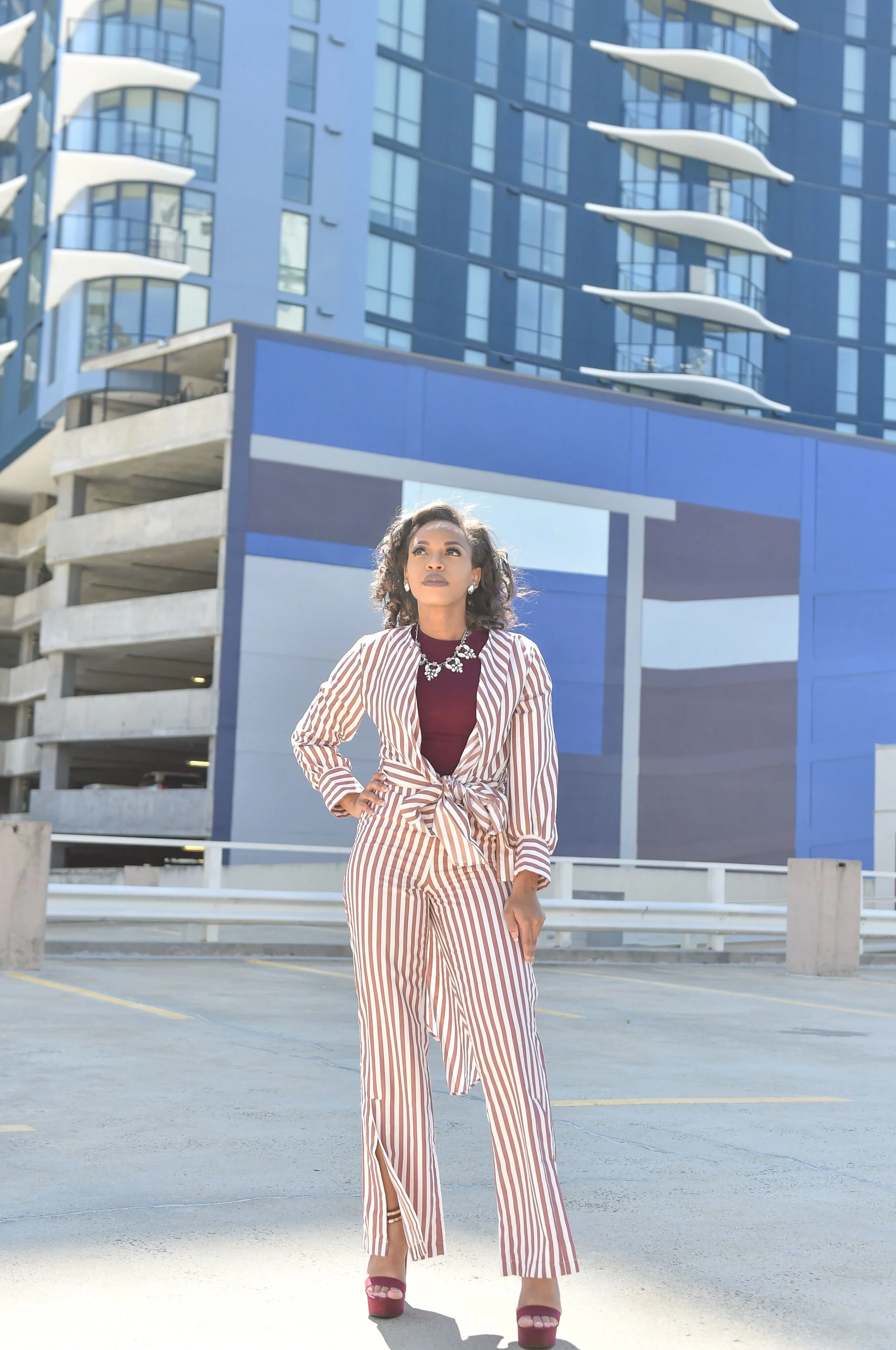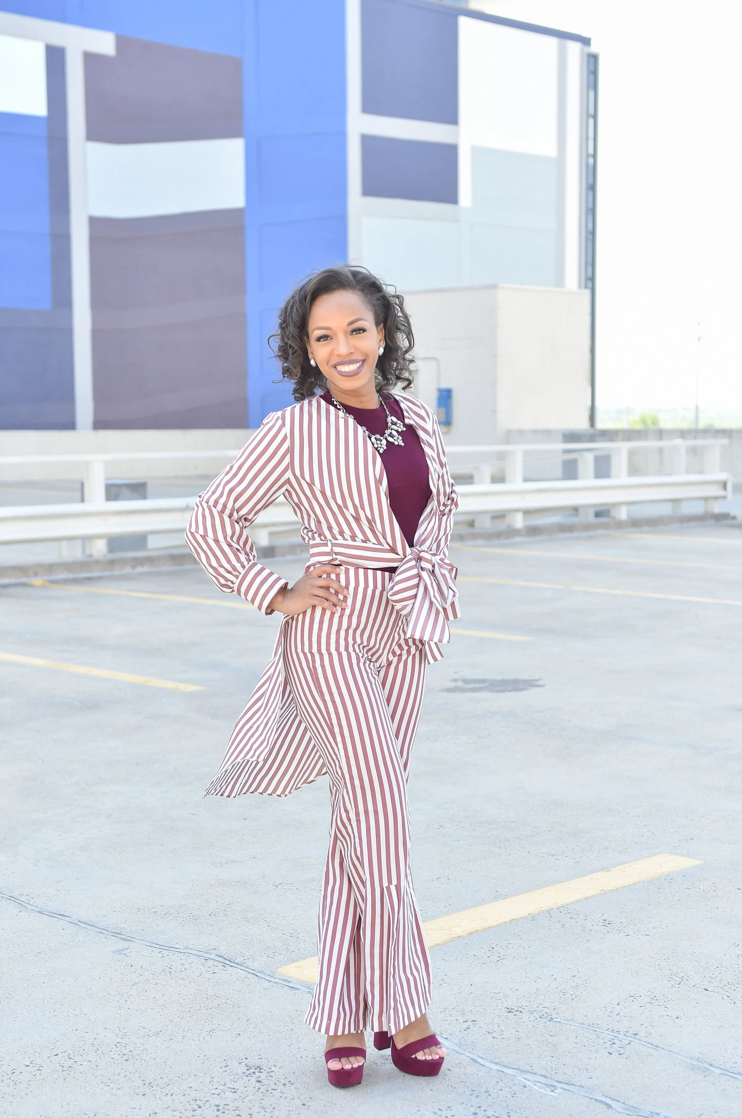 I purchased this white and burgundy striped two-piece set from House of Chic LA a few months ago and couldn't wait to wear it. I decided to wear a burgundy crop top that I bought from Marshall's last year and burgundy, chunky heels from Charlotte Russe. I can't remember where I bought my necklace but it is one of my faves. did you figure out that burgundy is my favorite color?