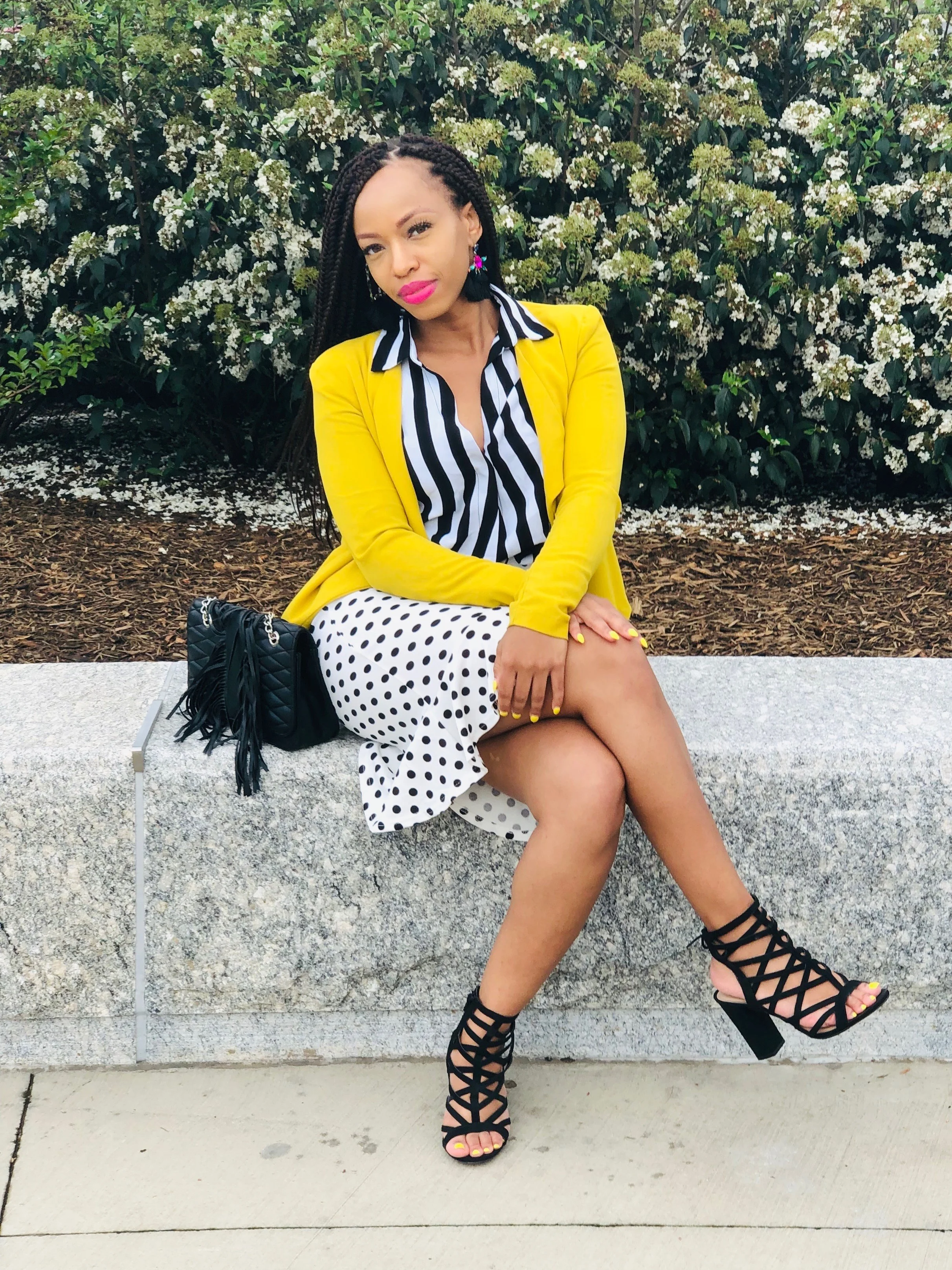 Given that Spring is officially here, it’s time to bring out those bright colors! Also, this is prime time to mix up your prints. This is why fashion and style is so much fun because you are in control of whatever you want to wear. I decided to mix a black & white polka dot skirt (bought in Panama) with a black & white striped shirt (Lilly’s Kloset) and a solid dijon mustard blazer (Windsor Store). I accessorized with black tassel earrings that have blue, green, and pink stones for a color pop (Aldo), black fringe purse (Aldo), and black chunky heels (Charlotte Russe).